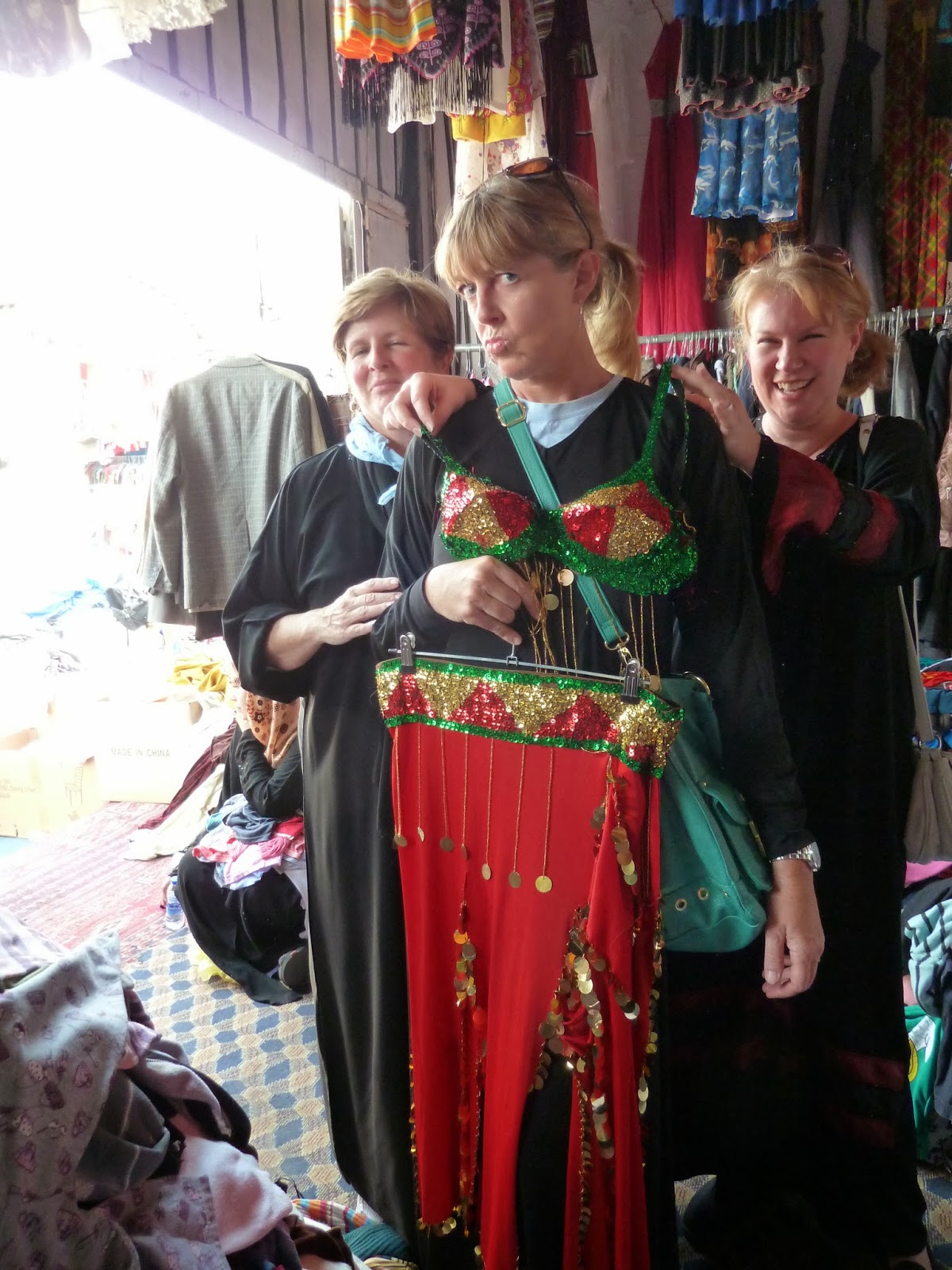 But narrowing your focus helps. The bus from our compound goes every month, and there’s a cadre of women who never miss. Yes, these women have all their teeth. They don’t grub in each others’ trash. They bathe regularly, know how to behave in restaurants, and speak in complete sentences, many in multiple languages. And at the souk, they know where to look, which is not at the chaos of shirts and pants and children’s clothes at waist level, nor at whatever funk might be underfoot, but all the way up at the rafters.