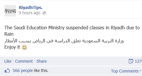 (Don’t assume the sideways or wrong-facing cars got pushed that way.) RiyadhTips, my source for the above two pictures, has a Facebook page that’s a terrific place to find all kinds of information that would be hard to ferret out for yourself. Such as this little nugget, which should delight everyone who’s ever rolled eyes at the way schools close in Atlanta or Nashville after a couple of inches of snow: