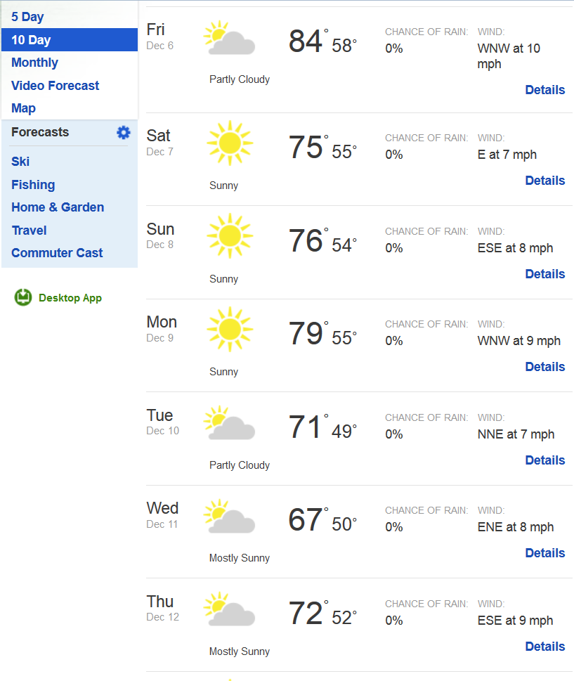 Do you see it? There’s a HUGE turndown. Partly cloudy (or “mostly sunny”–not sure of the difference) and right around 70 for THREE DAYS. It’s beginning to feel a lot like Christmas, eh?