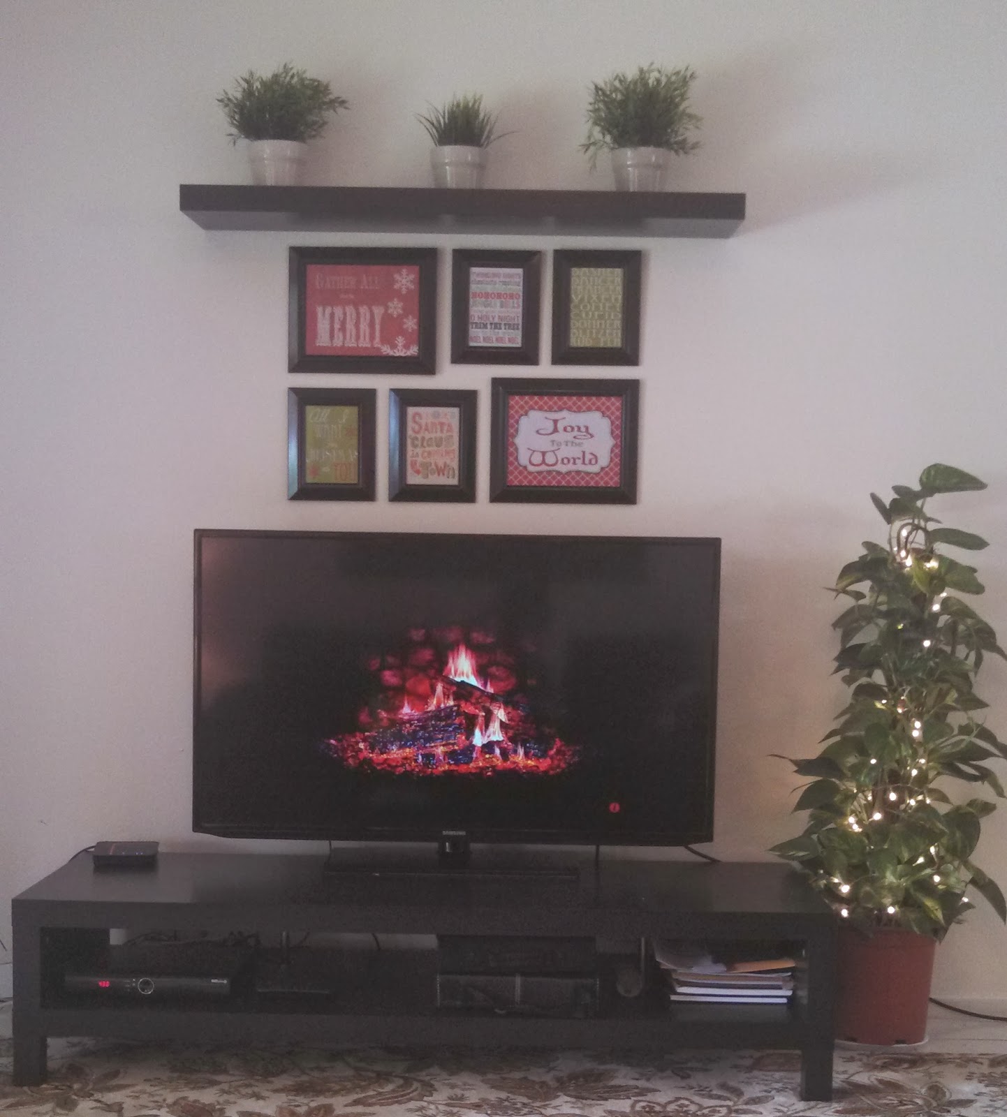One of the all-IKEA furnishings in my furnished villa is an odd floating shelf, all by itself way too high on my living room wall. It would make a great decoratable mantle (I’ll be getting a couple of hefty shelf brackets when I’m home), but 220v power means monster cords and inconvenient outlets, so there’s no way to put little lamps or a nice bunch of those lights in some sort of garland up there. So, thanks to Pinterest, I scrounged up some Christmas printables and put them below it in frames that will hold family pictures after the holidays are over. Plug in the iPad playing a fireplace app and voila. Happy almighty holidays.