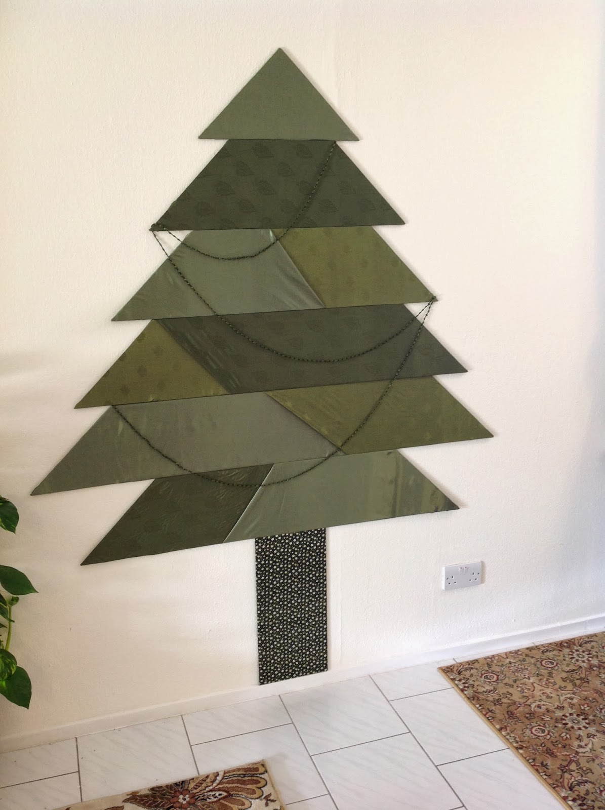 Finally, the tree. You can buy Christmas trees here if you’re determined. Departing expats are always selling them, or the shop inside the compound has small ones (flashing like crazy). I understand the two-story toy store near us has a few in a back corner of the shop, and if you look at them someone will sidle up, ask under his breath whether you want one, then slip you a photo price list. But I don’t want to store one all year. I like this whole living lightly thing. Pinterest, again, to the rescue: