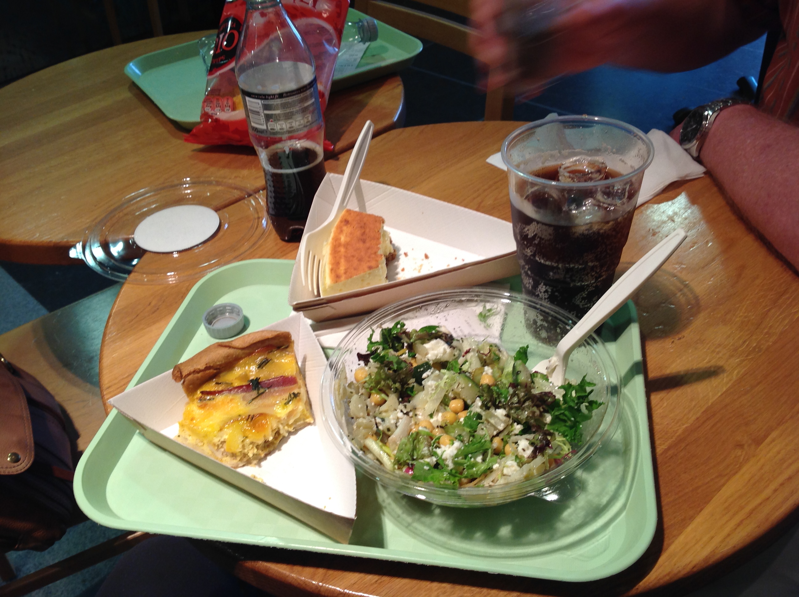 A salad of spring greens, baby chickpeas, feta chese, radish shreds, arugula, and baby cucumbers, dashed with oregano and basil. A gruyere and bacon tart. (The crust was divine.) A dab of cheesecake from The Beloved’s tray. I rarely eat as well as I did at the self-serve on Concourse K at Charles DeGaulle Airport. (Nor do I pay as much. That part of the impression can be confirmed.)