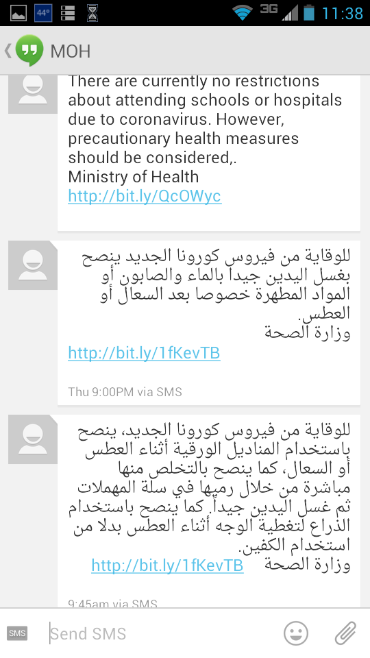 (This is the sum total of Ministry of Health information I’ve received about MERS. One text in both English and Arabic, one in only Arabic. I may be missing a thing or two.) - And finally, the global community is going to have to get used to leaving a lot of things in God’s hands.