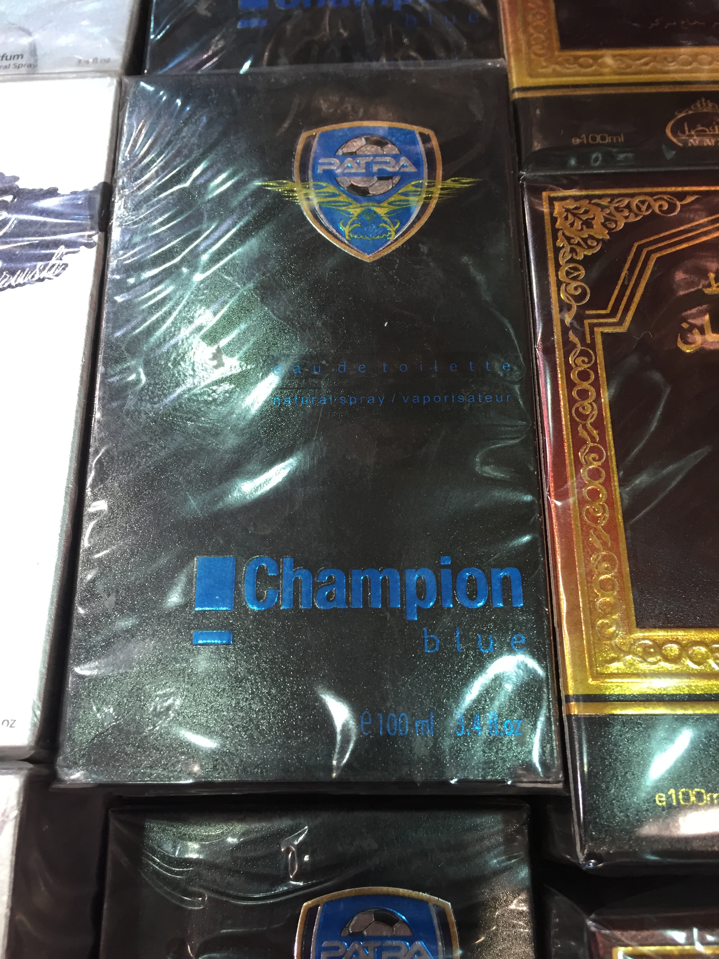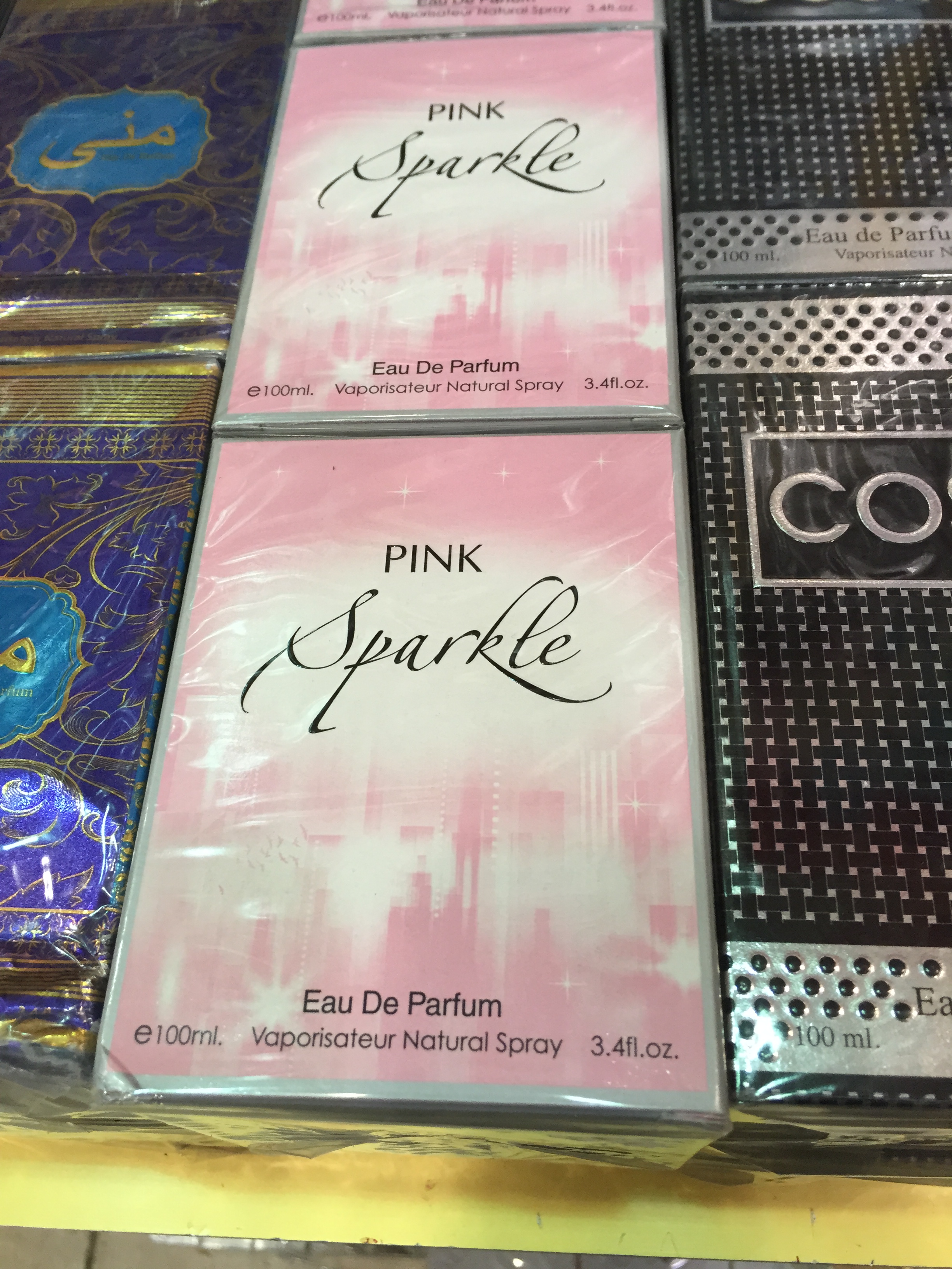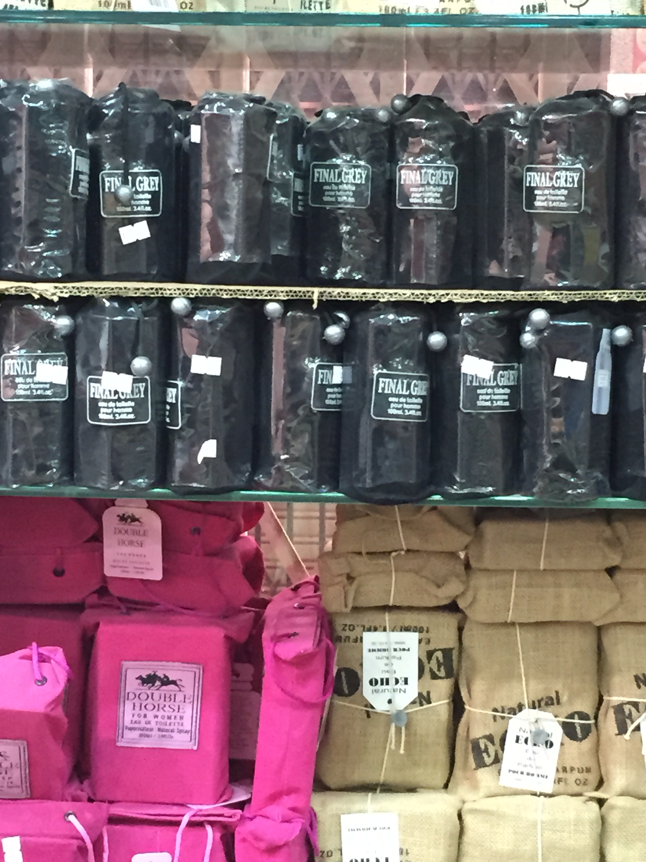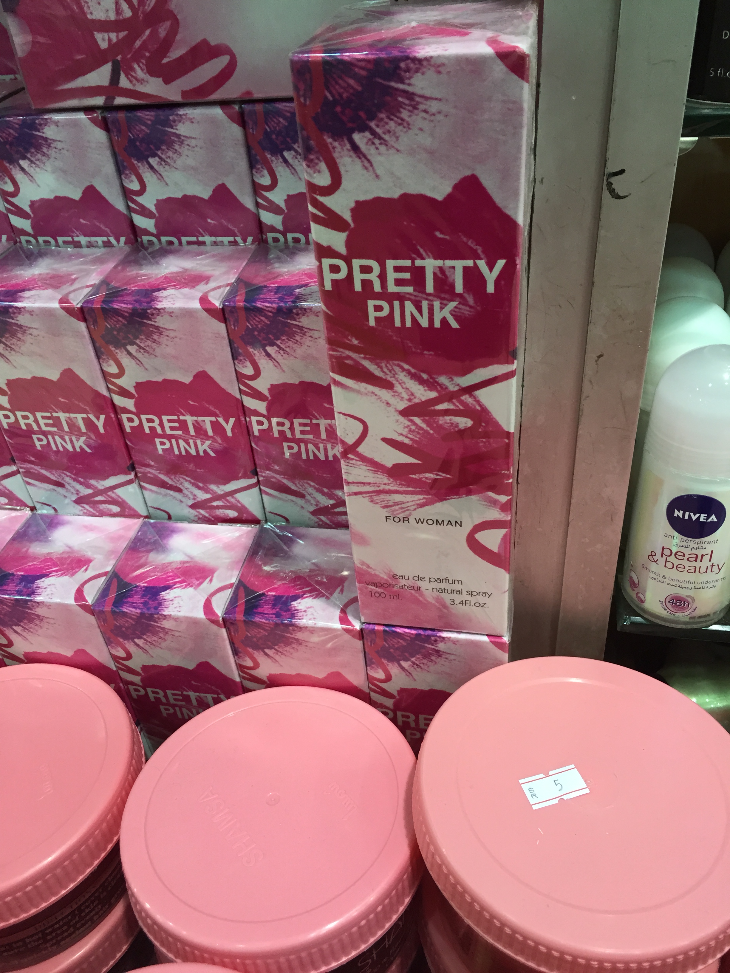 But after a visit to the 5-SAR stores at my favorite Diriyah souk, I’ve had my perfume-shopping mind blown open. To help you get the setting, SAR (also “sr”) is the English shorthand for Saudi Arabian riyals. The riyal is pegged to the dollar, and is fixed at $.27, so a 5-SAR store is roughly comparable to a dollar store. This is one of them: