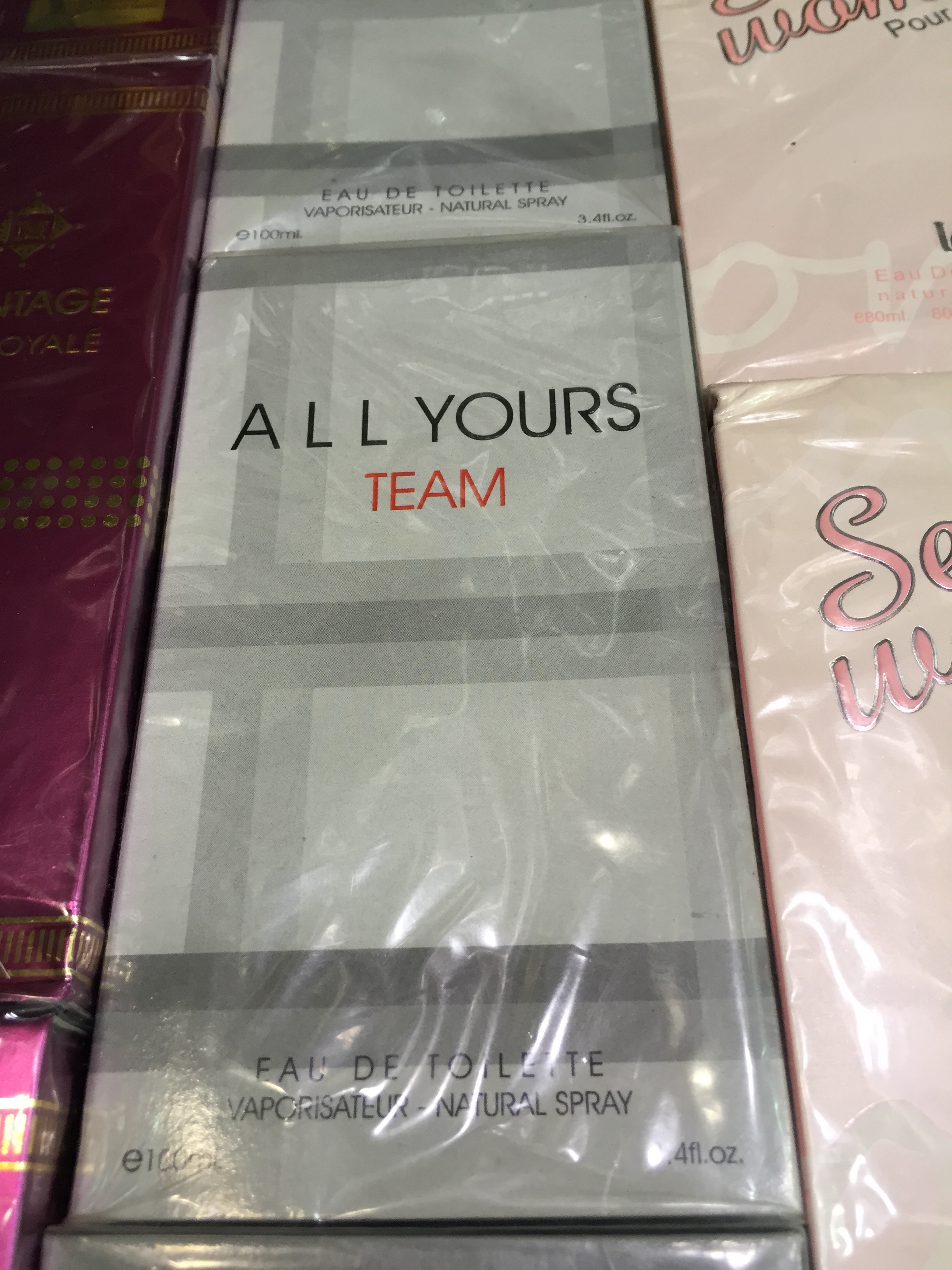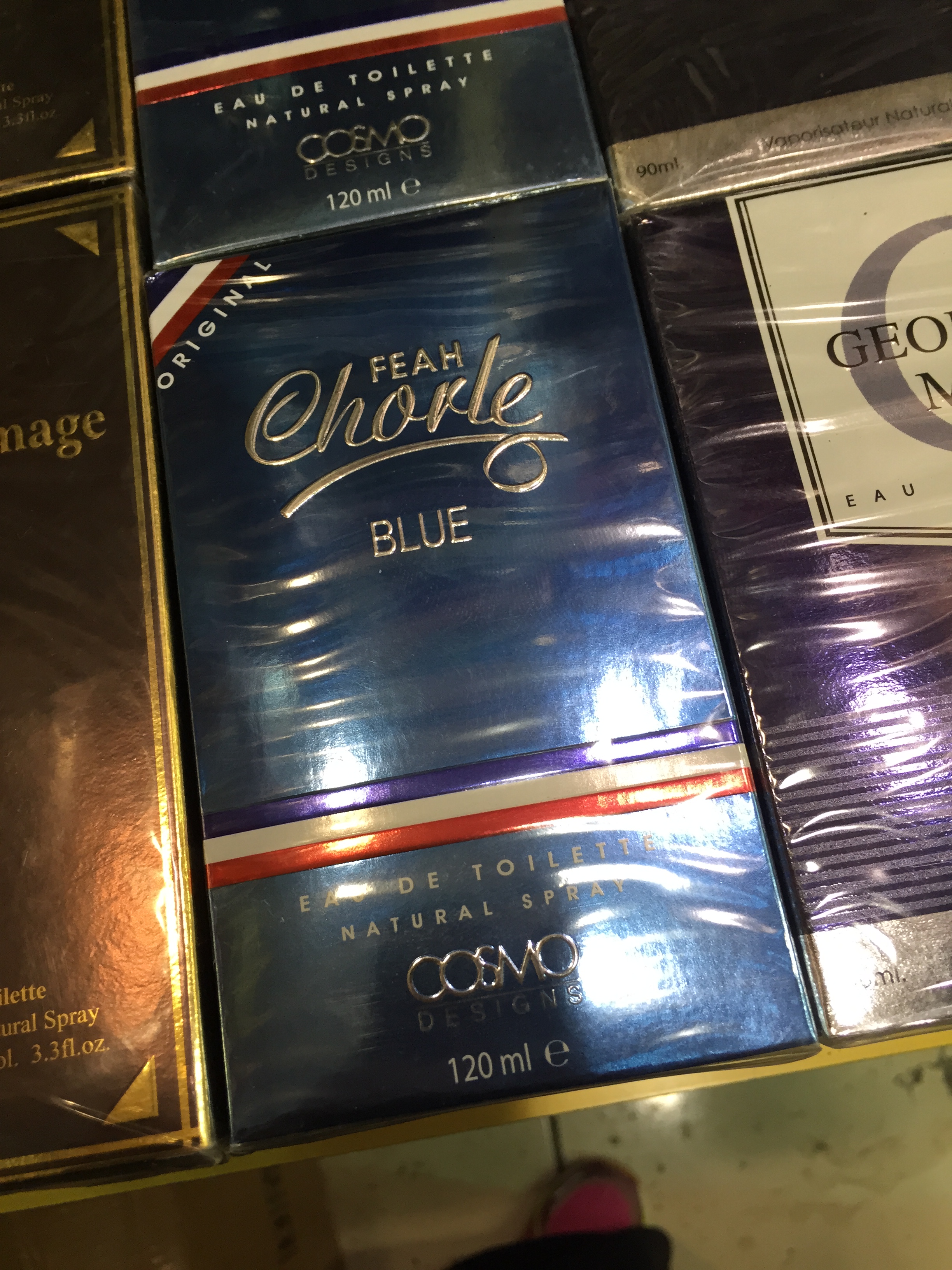 Buying perfume at a store principally devoted to food or household goods is not unheard-of in the U.S. I have long held a spot on my list of Saddest Places on Earth for the Walgreen’s fragrance counter on Christmas Eve. I had to stop into a Walgreen’s for aspirin or some darn thing once on the 24th and couldn’t find a subtle way to get a picture of the DESPERATE crowd of men choosing between Chaps and White Diamonds and something by Brittney Spears. (Note to dudes: If you show up on Christmas with nothing for your wife but Walgreen’s perfume, you might as well just skip it.)