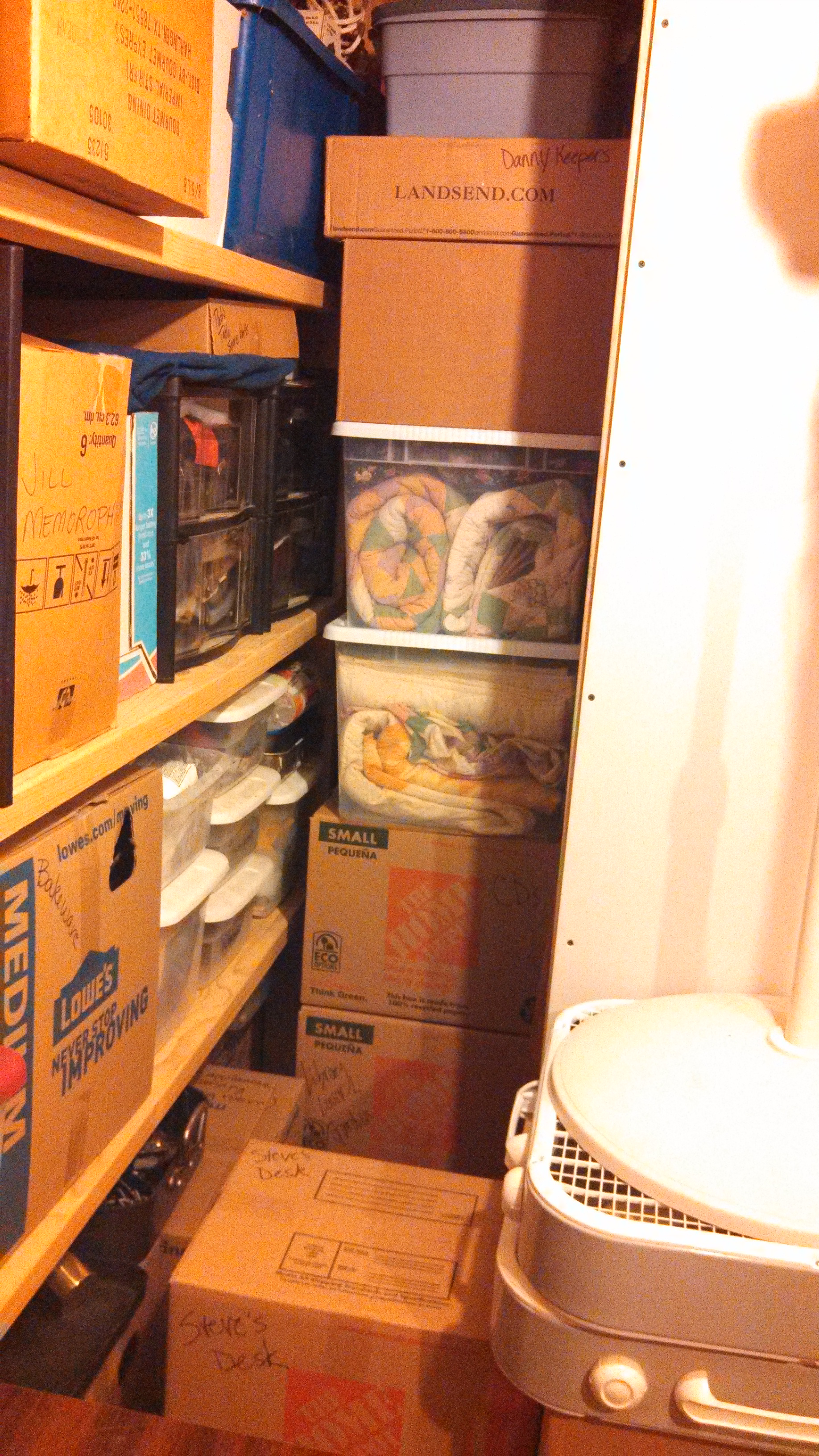 These are in-progress pictures of the space that belongs to me in my old home. Renters have the rest of the house for one more month, and everything I own got crammed into basement storage rooms before I left: