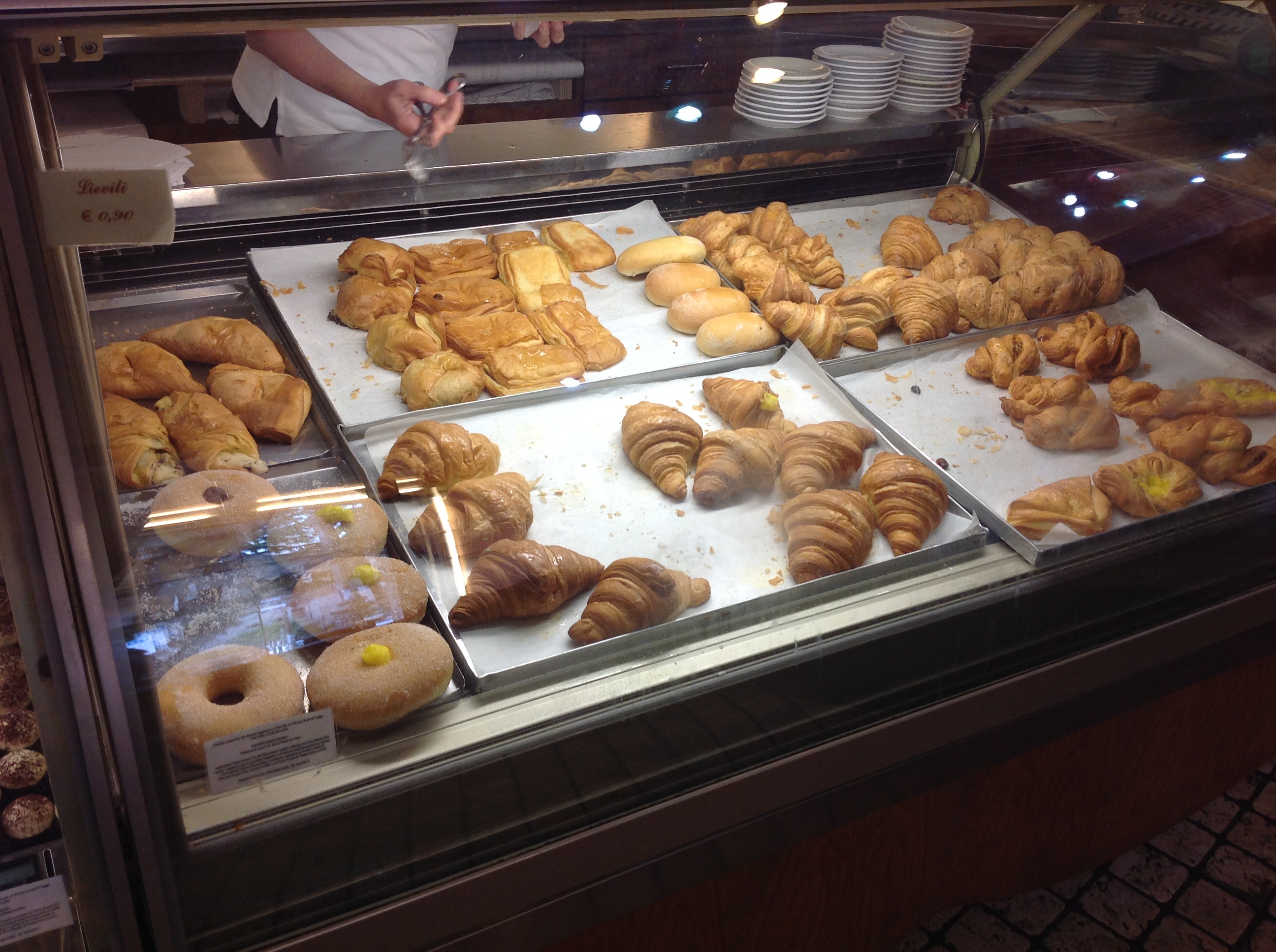 In Italy, the typical breakfast is a cornetto (just don’t call it an “Italian croissant” around an Italian) and a cup of espresso, eaten standing at the counter at a neighborhood bakery or cafe, elbow to elbow with the neighbors.