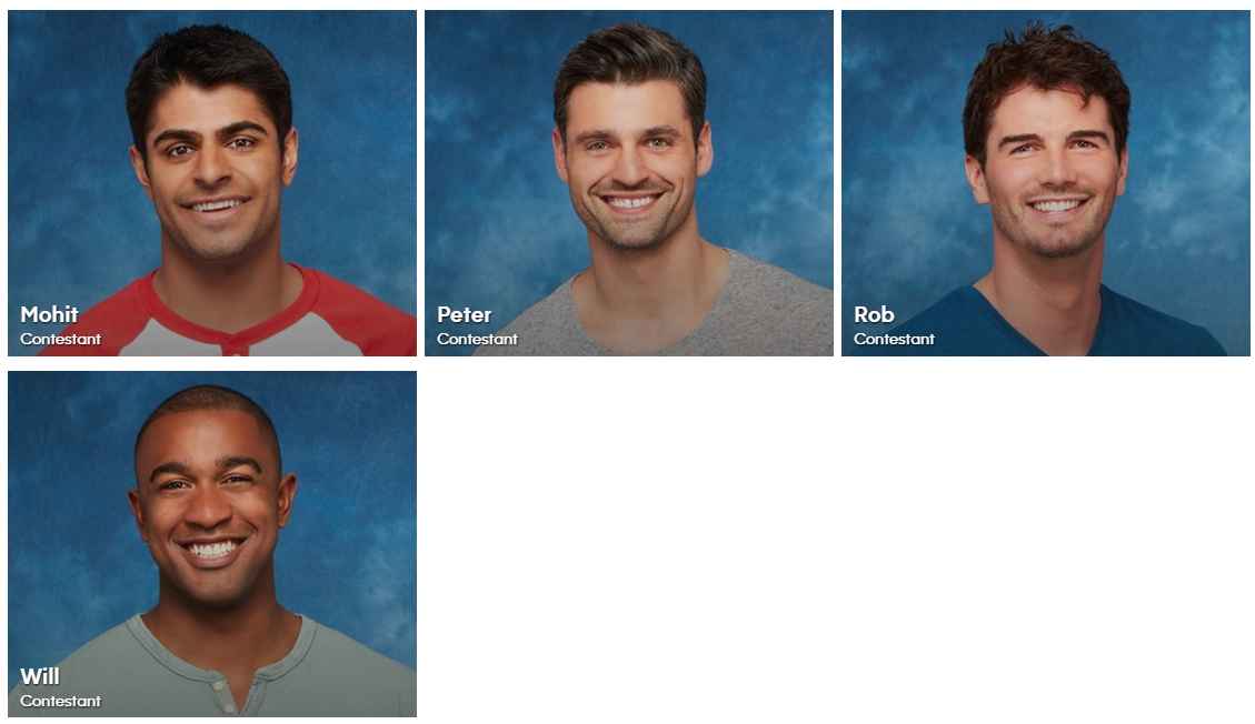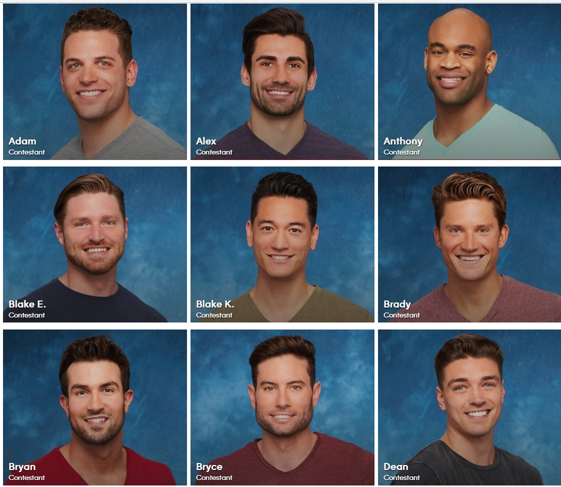 This is Rachel. She’s a 32-year-old lawyer, with a terrific sense of humor (a vastly undervalued resource in Bachelorettes). According to the bio, “Winning in court has never been a problem, but finding love is a case that unfortunately remains open.” She’ll be better than the bio. I’m VERY enthusiastic about this casting decision. And now, her many candidate boyfriends, who are fortunately listed in alphabetical order so I can screen-capture a block of them at once.