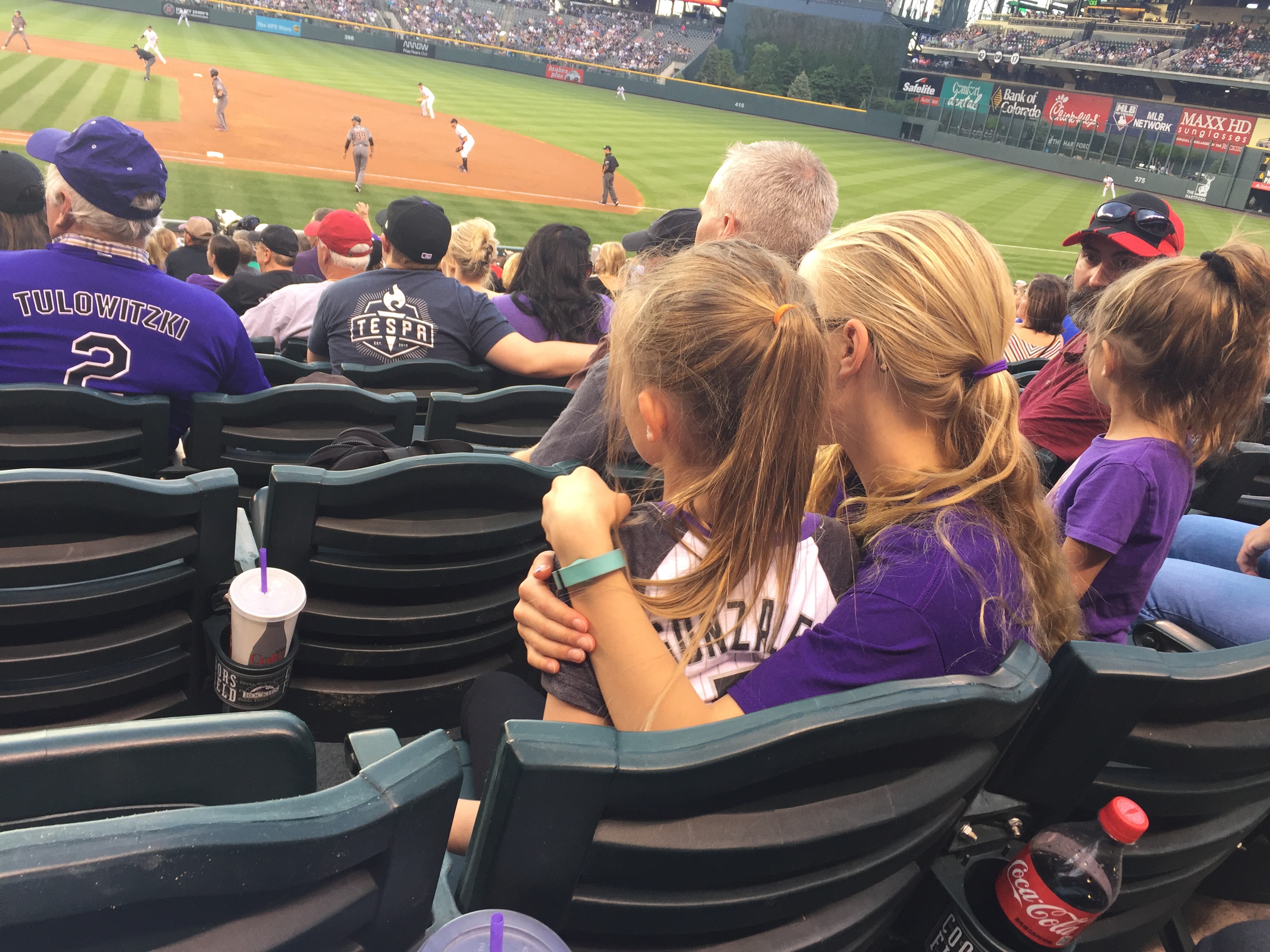 We had great seats, about 2/3 of the way down from the concourse to the field, so all the concessions and bathrooms were a decent way behind us, up the stairs. At some point Mom got up and left, I presumed for a bathroom and food run, after checking to see whether anybody wanted anything. Within a few seconds after she left, one little girl got up and darted after her, then returned. Then another left and returned. Then another left. You know how kids change their minds. The game went on.