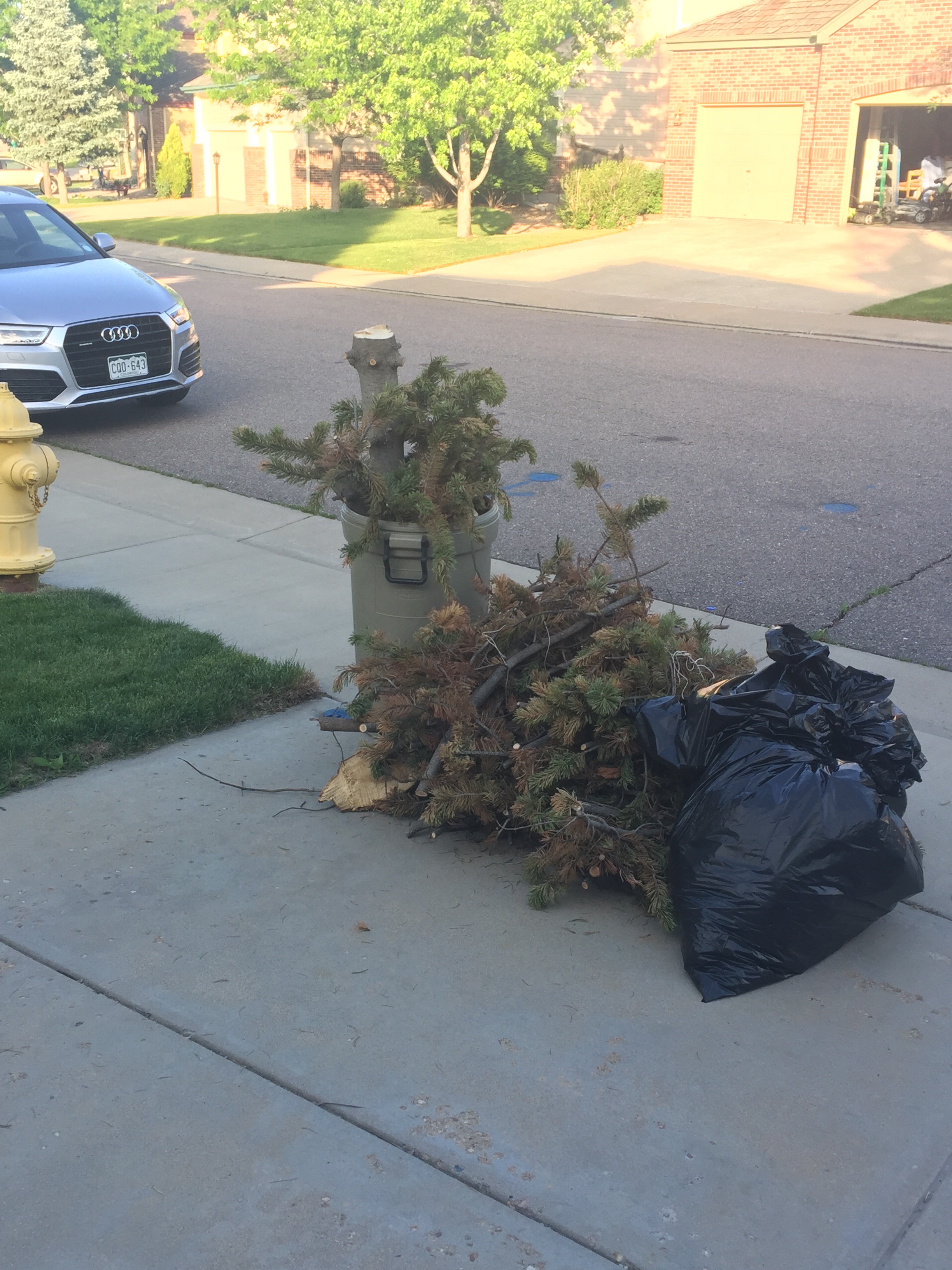 I mean, you can read the dying agonies there, can’t you? I’ve always hated that tree. I’ve got aspens all over the place, which grow out of shared roots, but that ugly pine has always been leaning away, not wanting to socialize…it probably died of a miserable heart. Good riddance. So I grabbed the bow saw and the loppers and went for it. I had a single mother who figured out how to get crap done, and I drew on that example when I was doing the heavy lifting to close up my life and move it to Saudi Arabia. Pshaw. This tree was nothing. Well, maybe not quite nothing. It did take the help of a couple of neighbors to get through the 9-inch trunk at the ground and reduce it to this: